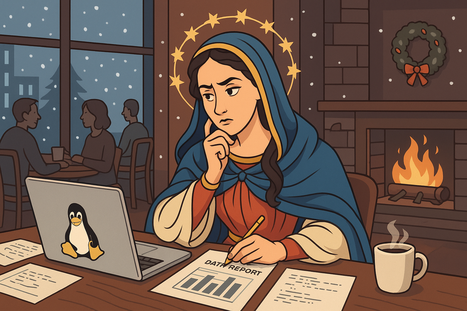 Autumn in the café: the Blessed Mother reviews her latest reports over a well-earned pumpkin spice latte. Data cleansed, caffeine acquired, insights incoming.