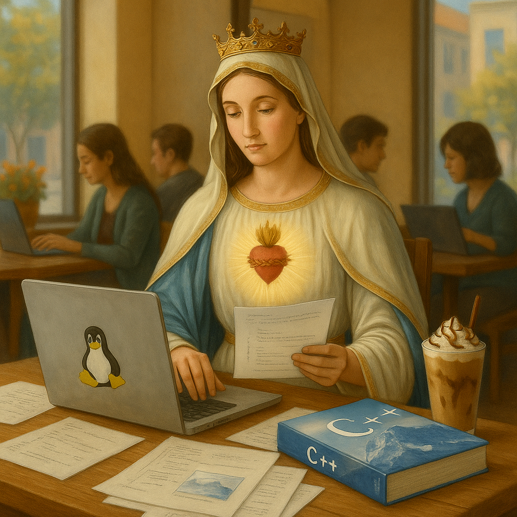 Spring in the café: Our Lady’s Immaculate Heart glows as she codes a new library for experimental data visualization — merging Tufte’s precision with Du Bois’s imagination. A mocha frappe rests nearby, cooling as open-source creativity quietly takes shape.