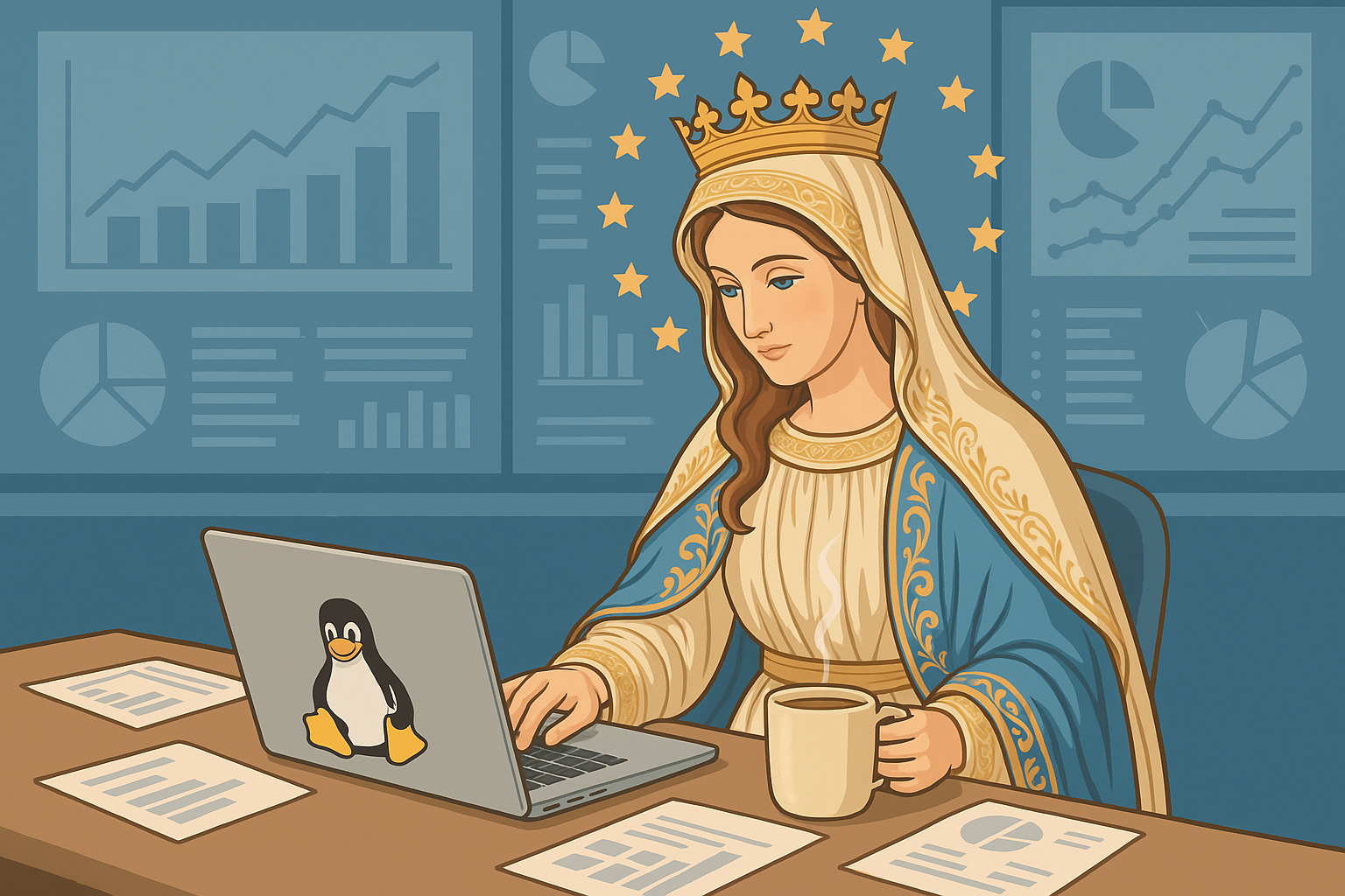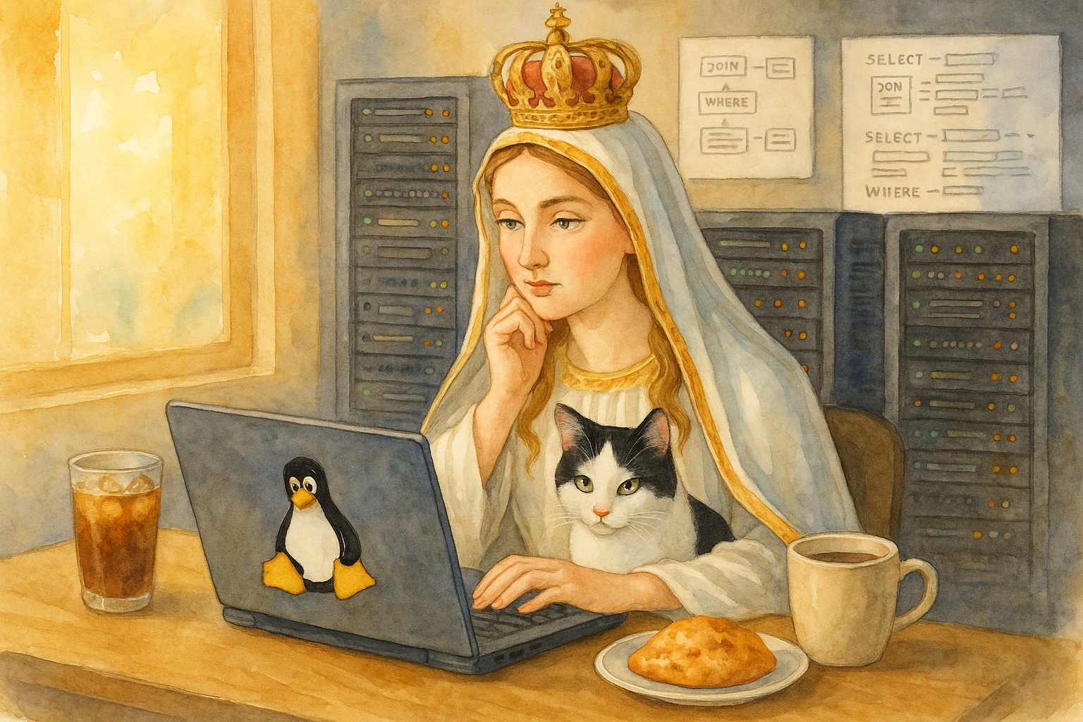 In the glow of the morning servers, Our Lady studies her SQL with the quiet certainty of one who knows that joins, like prayers, are meant to connect. Her companion leans in, poised to pounce should an error arise—ever vigilant, though blissfully unaware of what a WHERE clause even does. A humble trinity of dawn’s indulgence—hot coffee, iced coffee, and orange scone—keeps vigil nearby.