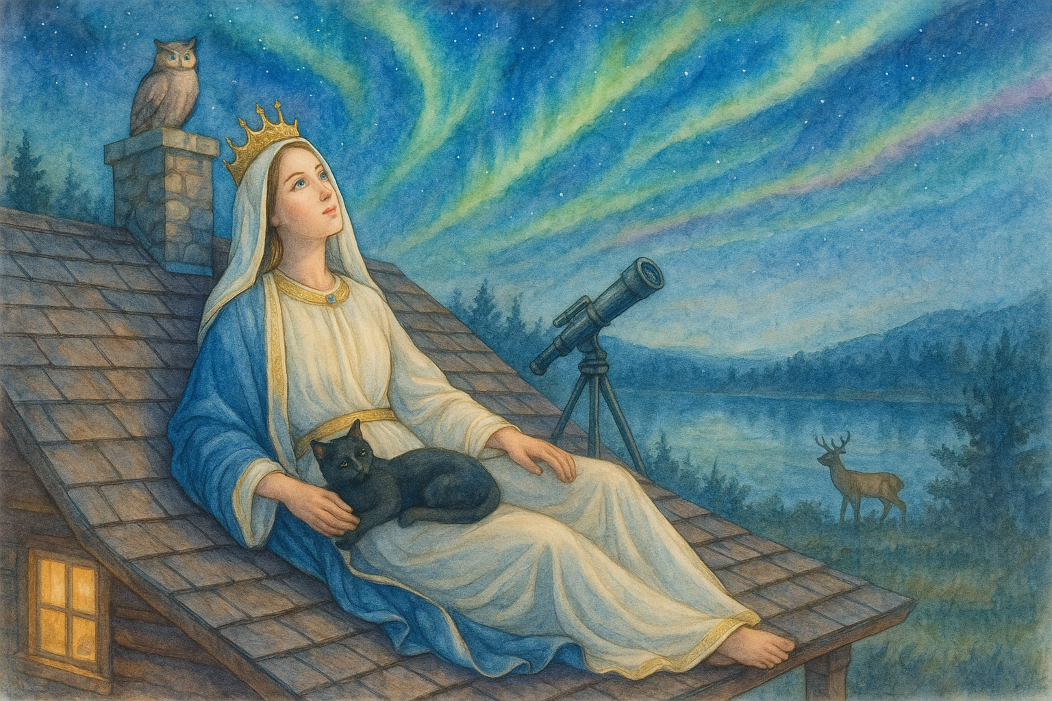 Our Lady reclines on her cabin roof beneath a sky painted in northern lights, her black cat curled in her lap, eyes half-closed in a quiet, contented drift. An owl perches on the chimney like a seasoned night scholar, blinking slowly as if evaluating the heavens for itself. Down by the lake, a deer lifts its head mid-step, briefly pausing as though it too has noticed something wondrous in the shifting sky. Beside her, the telescope waits quietly — a reminder that some nights invite questions as gently as they offer answers.