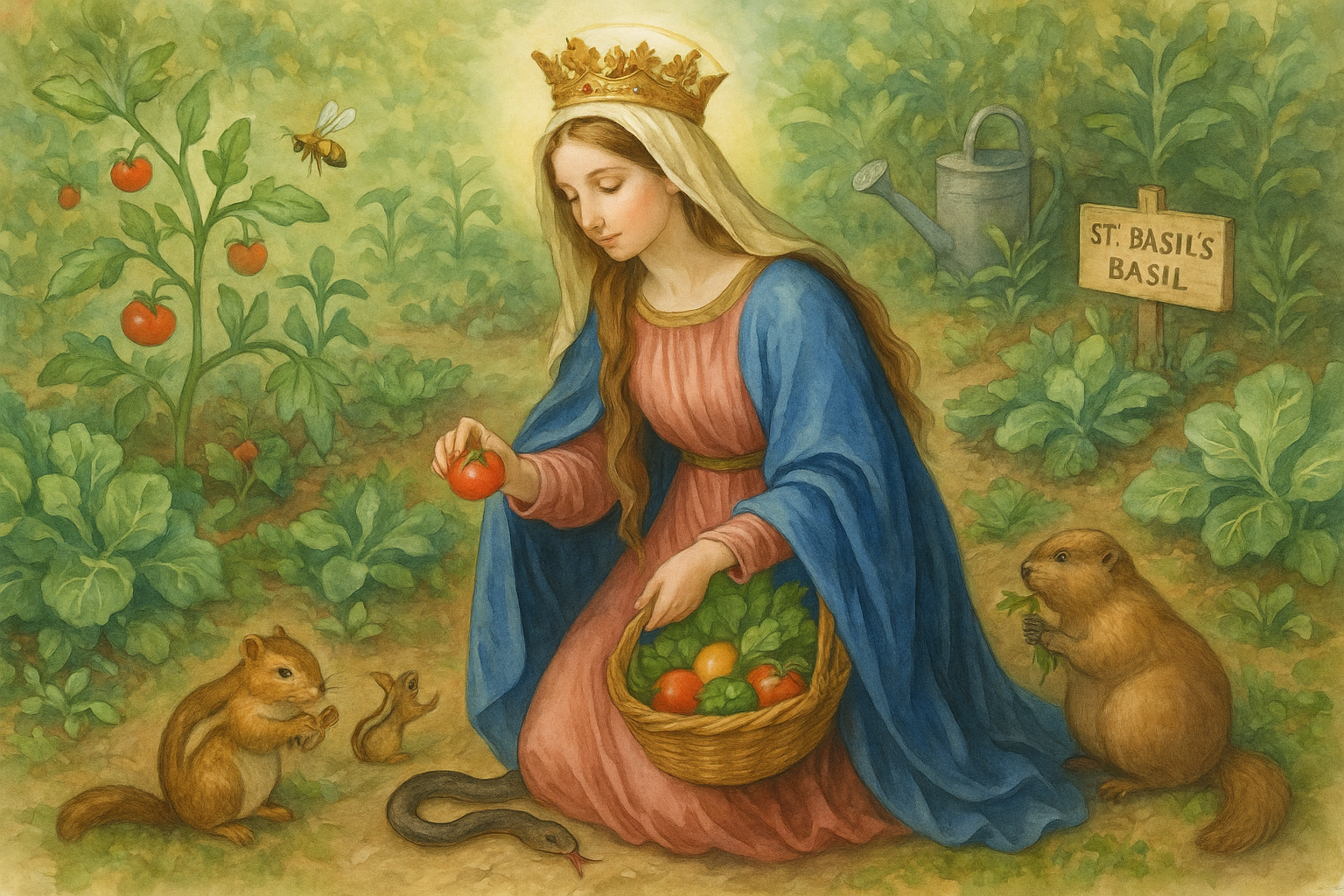 Our Lady pauses to judge a tomato’s worthiness while the garden carries on around her: chipmunks snacking without a care, bees making their gentle rounds, and a plump groundhog snacking like it paid admission. Beneath her heel, the serpent stays politely in place — a gentle reminder of who’s in charge of this garden plot.