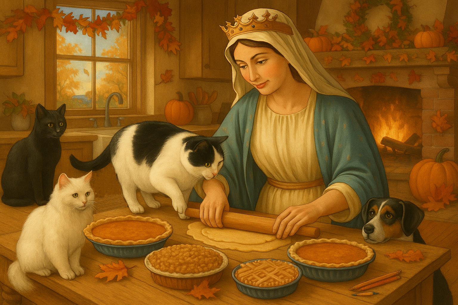 Late autumn in the kitchen: Mary prepares pumpkin and apple pies while her little audience waits for crumbs of grace — and crust. One cat can’t resist inspecting her handiwork, and she smiles, knowing curiosity is part of every good creation.