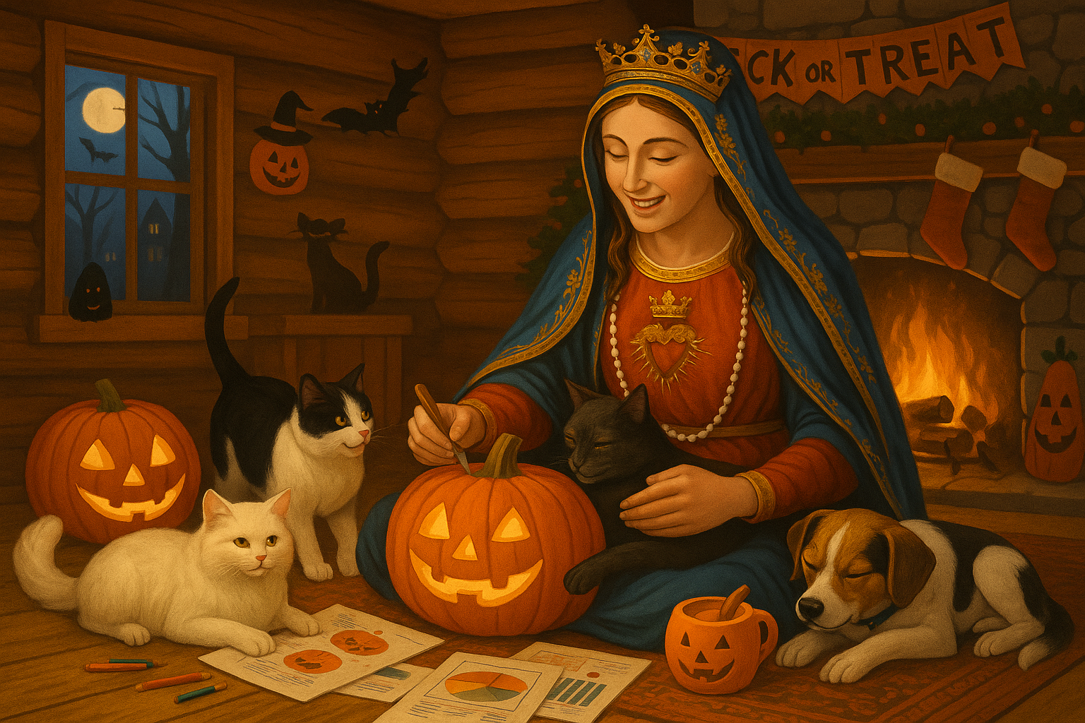 Halloween at home: Our Lady of the Rosary sets her data work aside to carve jack-o’-lanterns by the fire. The cider’s hot, the pets are drowsy—except for one curious cat plotting an ambush on a pumpkin. She laughs as the cat prepares its attack, convinced it’s helping with the carving.